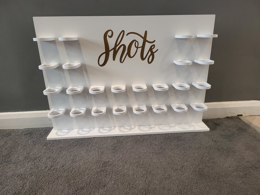 Did someone say shots!!!! Our table top shot wall is a great add on for any event. This shot wall holds 24 shots all to need to do is provide the alcohol.